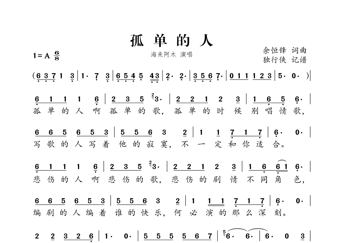《孤单的人》是海来阿木演唱的一首歌曲,拍号为6/8拍,这份简谱共有一张高清图谱,图谱由 @独行侠 编配上传。