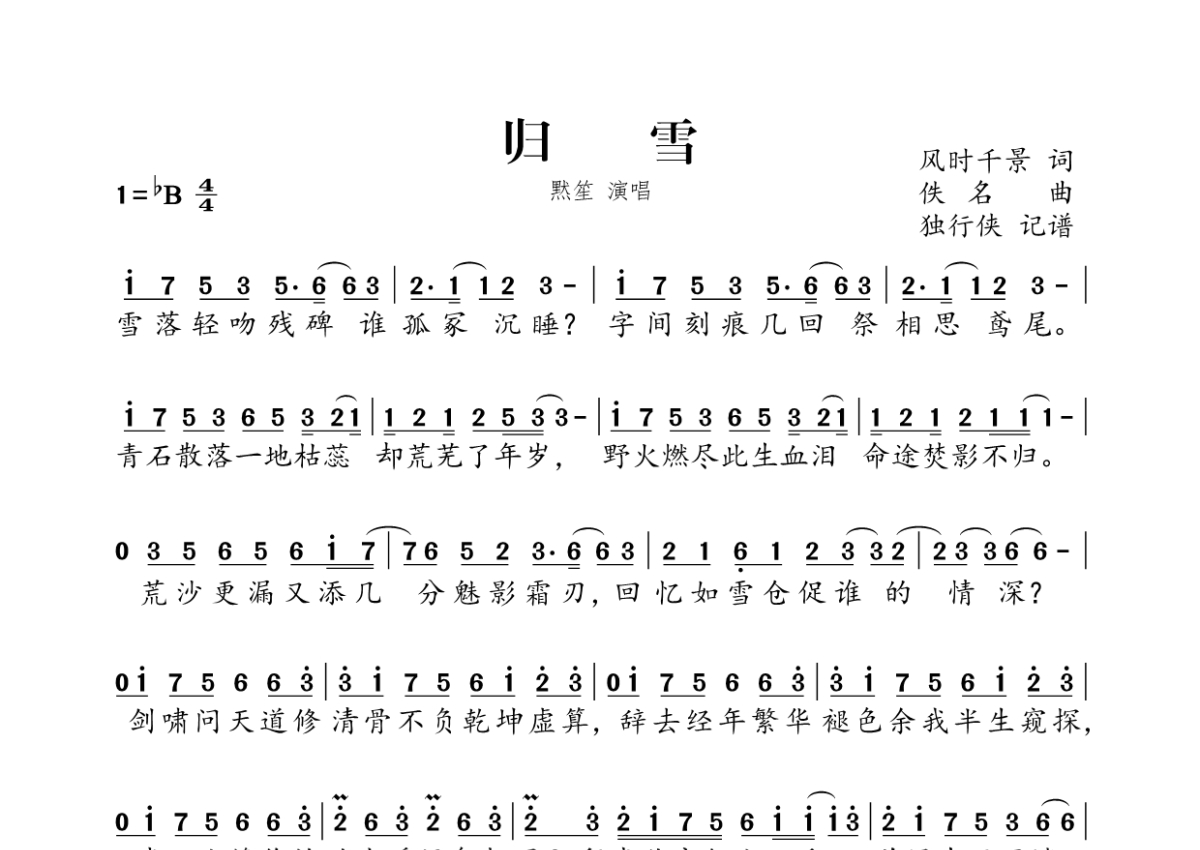 《归雪》是默笙演唱的一首歌曲,拍号为4/4拍,这份简谱共有两张高清图谱,图谱由 @独行侠 编配上传。