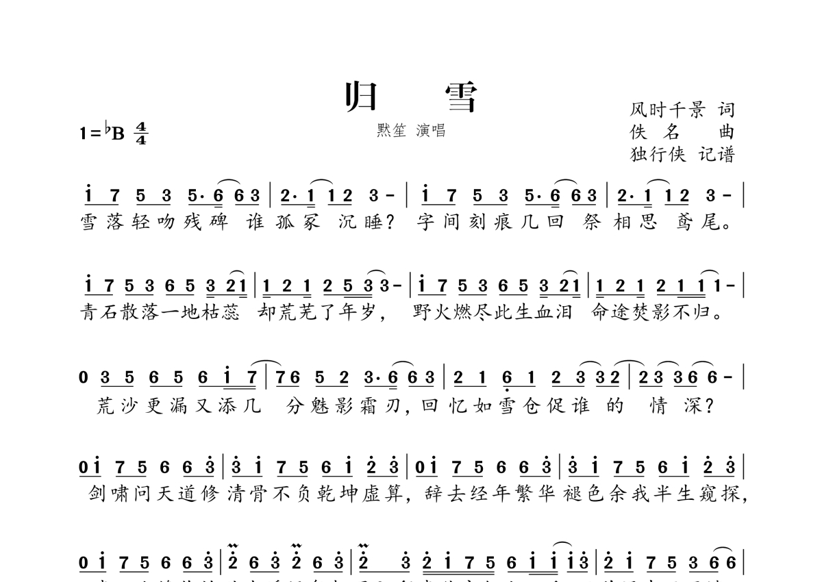 《归雪》是默笙演唱的一首歌曲,拍号为4/4拍,这份简谱共有两张高清图谱,图谱由 @独行侠 编配上传。