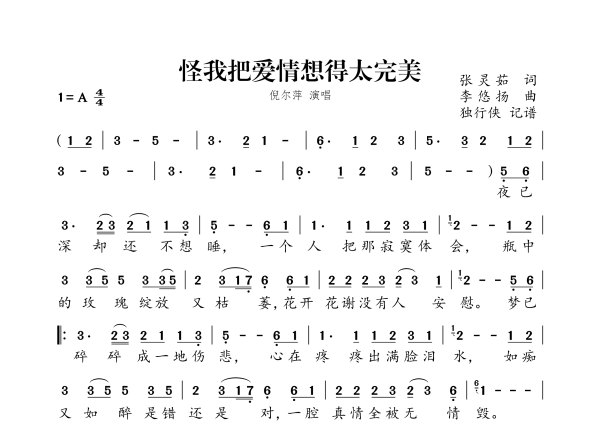 《怪我把爱情想得太完美》是倪尔萍演唱的一首歌曲,拍号为4/4拍,这份简谱共有一张高清图谱,图谱由 @独行侠 编配上传。