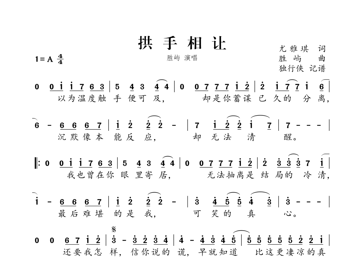 《拱手相让》是胜屿演唱的一首歌曲,拍号为4/4拍,这份简谱共有一张高清图谱,图谱由 @独行侠 编配上传。