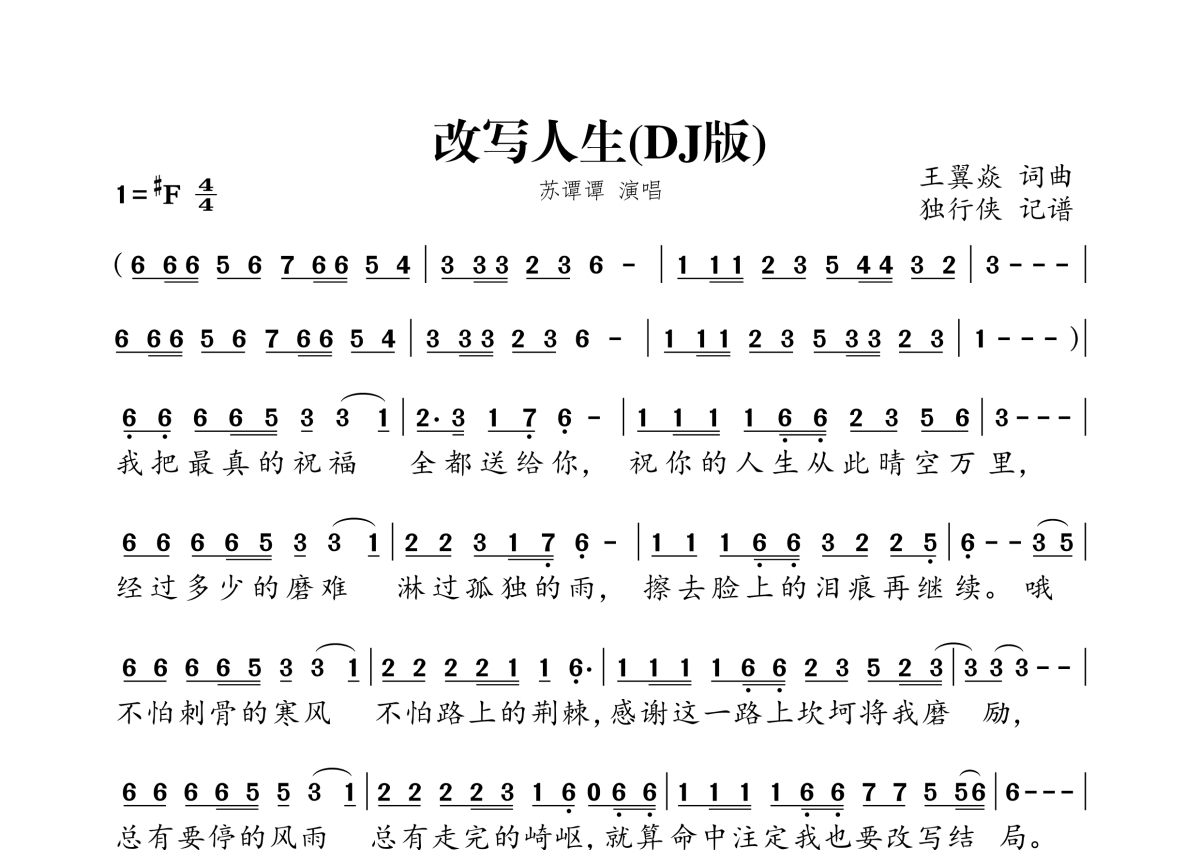 《改写人生》是苏谭谭演唱的一首歌曲,DJ版,拍号为4/4拍,这份简谱共有两张高清图谱,图谱由 @独行侠 编配上传。