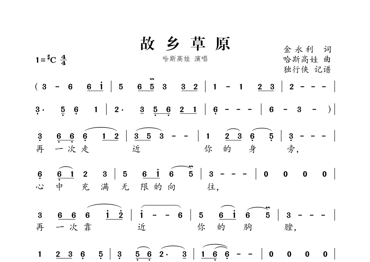 《故乡草原》是哈斯高娃演唱的一首歌曲,拍号为4/4拍,这份简谱共有两张高清图谱,图谱由 @独行侠 编配上传。