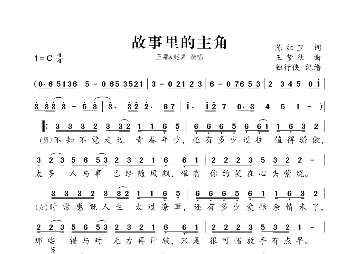 《故事里的主角》是赵真&王馨演唱的一首歌曲,拍号为4/4拍,这份简谱共有一张高清图谱,图谱由 @独行侠 编配上传。