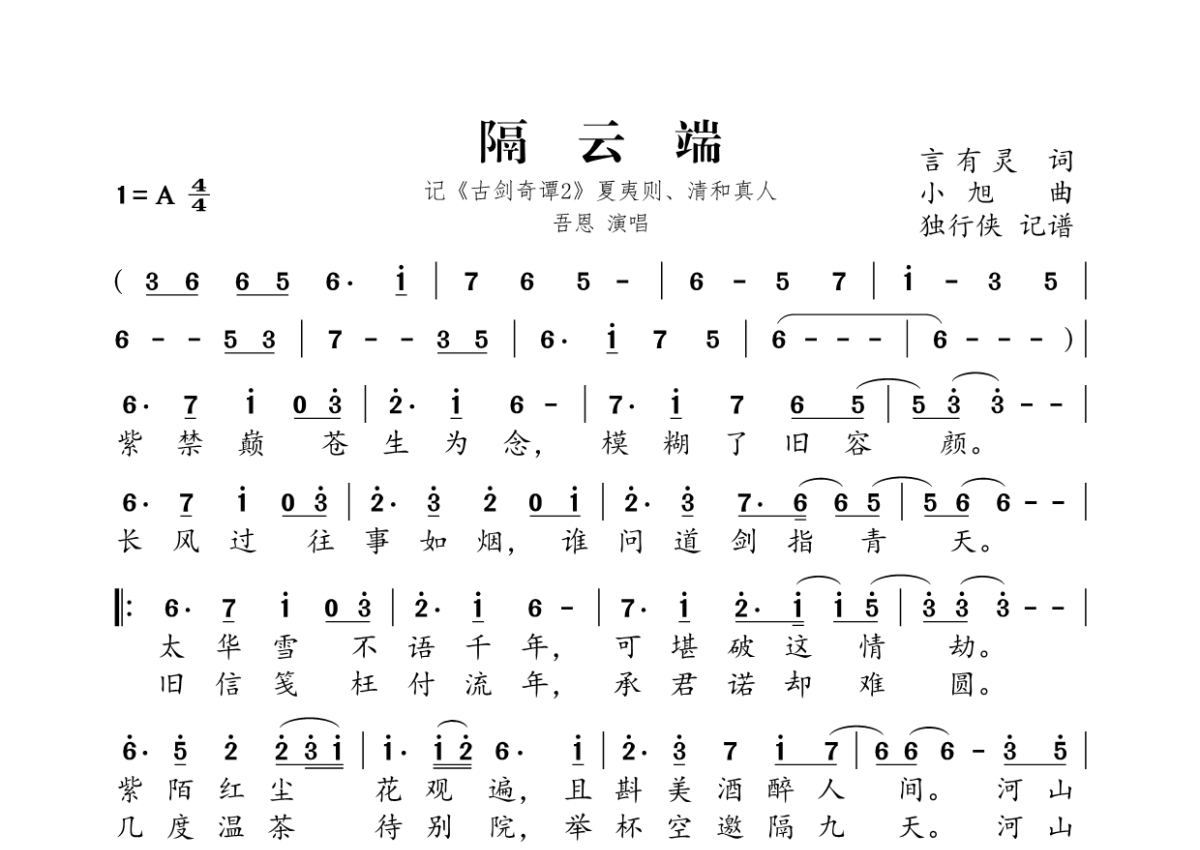 《隔云端》是吾恩演唱的一首歌曲,拍号为4/4拍,这份简谱共有一张高清图谱,图谱由 @独行侠 编配上传。
