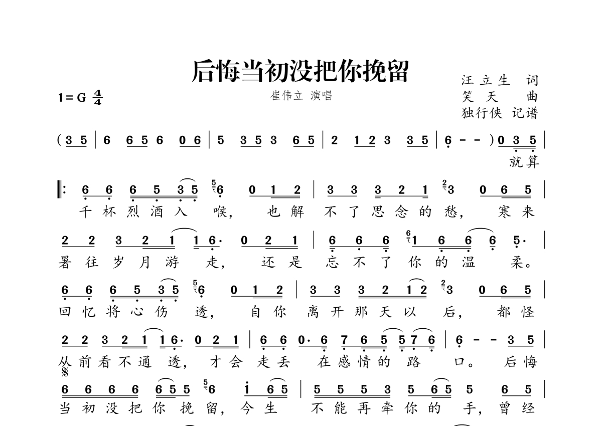 《后悔当初没把你挽留》是崔伟立演唱的一首歌曲,拍号为4/4拍,这份简谱共有一张高清图谱,图谱由 @独行侠 编配上传。