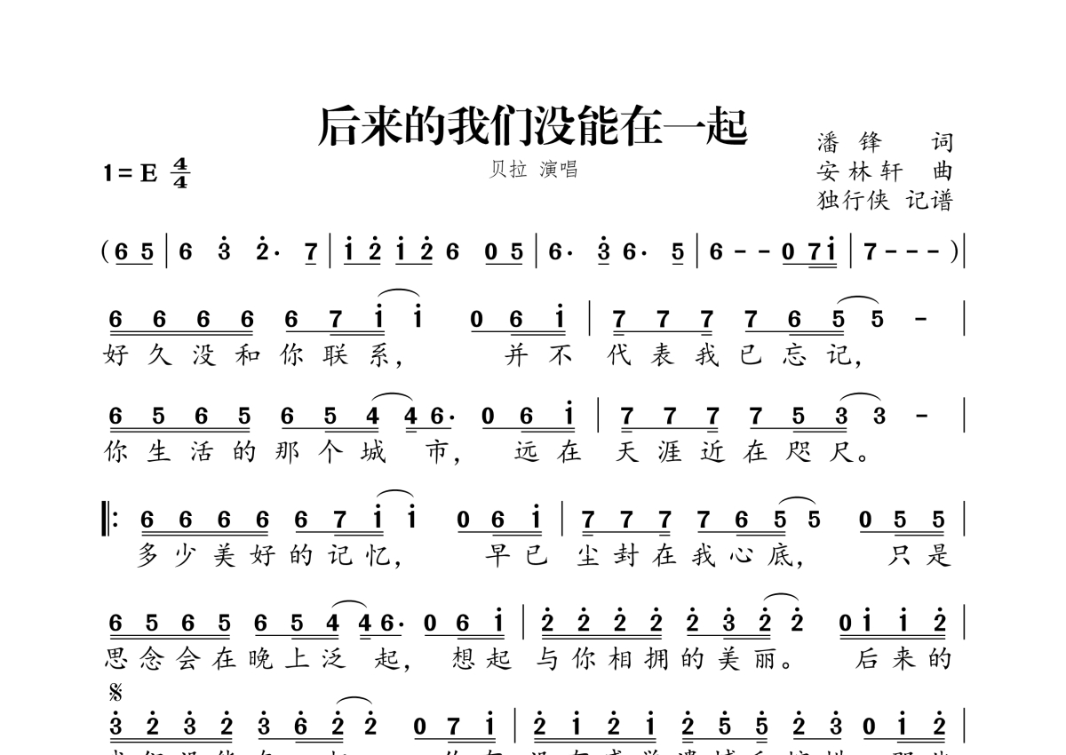 《后来的我们没能在一起》是贝拉演唱的一首歌曲,拍号为4/4拍,这份简谱共有一张高清图谱,图谱由 @独行侠 编配上传。