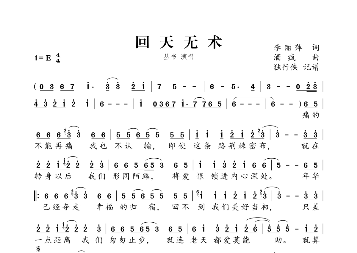 《回天无术》是丛书演唱的一首歌曲,拍号为4/4拍,这份简谱共有一张高清图谱,图谱由 @独行侠 编配上传。