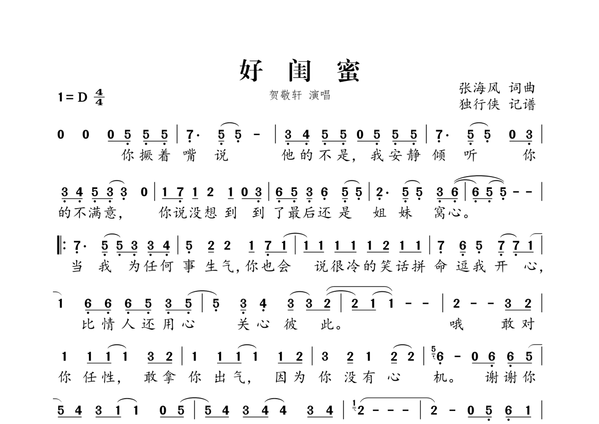 《好闺蜜》是贺敬轩演唱的一首歌曲,拍号为4/4拍,这份简谱共有一张高清图谱,图谱由 @独行侠 编配上传。