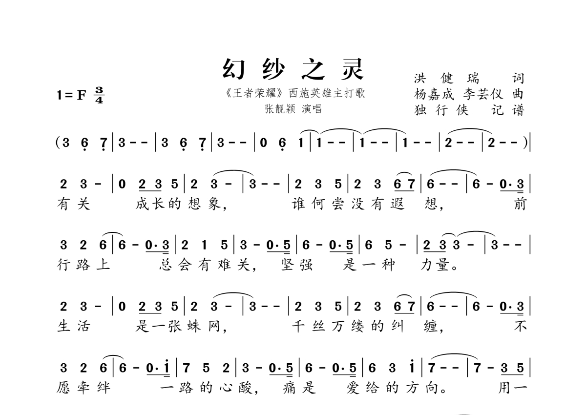 《幻纱之灵》是张靓颖演唱的一首歌曲,拍号为3/4拍,这份简谱共有两张高清图谱,图谱由 @独行侠 编配上传。