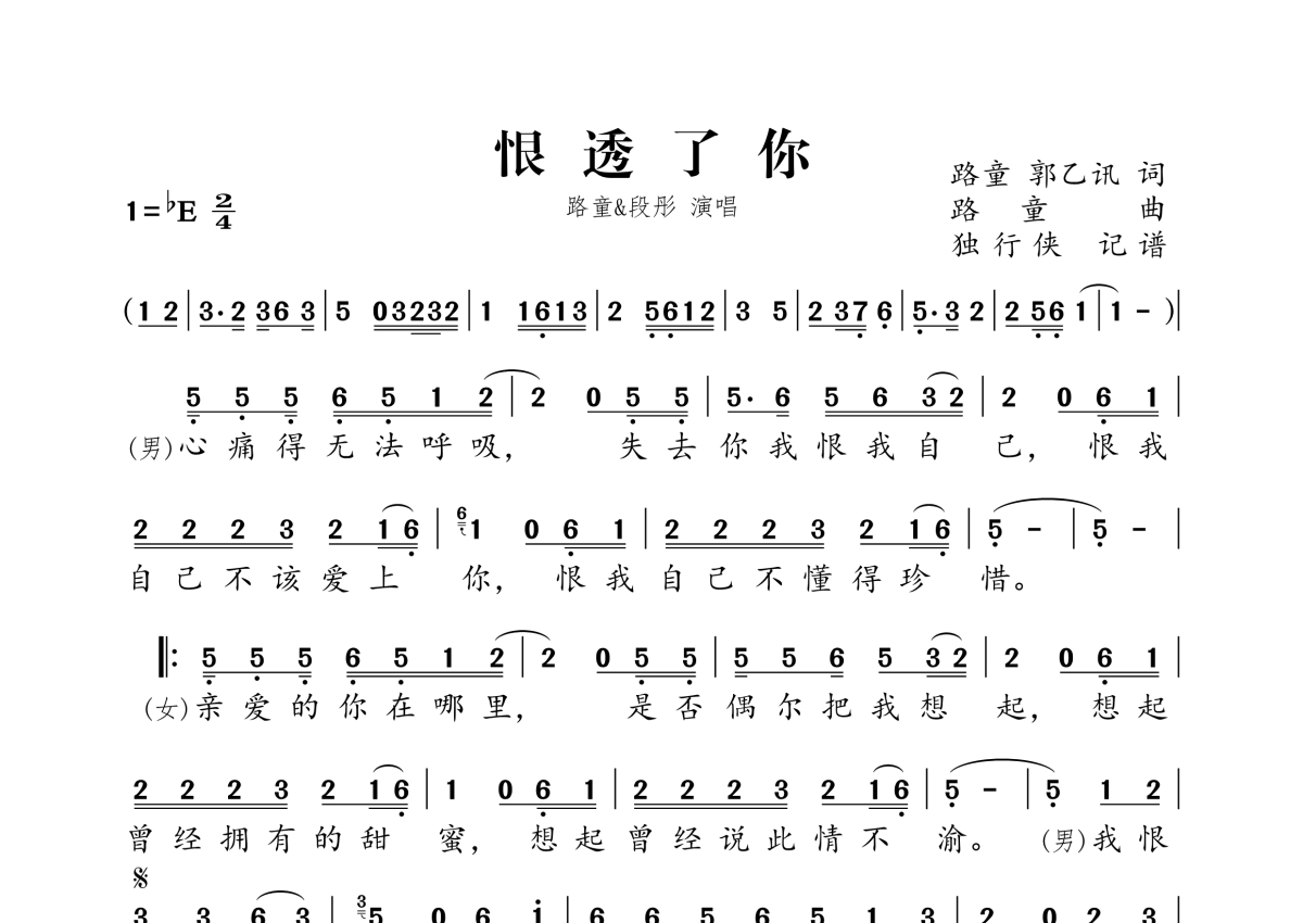 《恨透了你》是路童&段彤演唱的一首歌曲,拍号为2/4拍,这份简谱共有一张高清图谱,图谱由 @独行侠 编配上传。