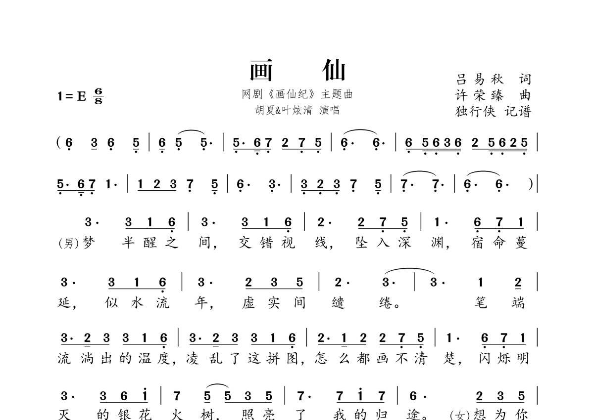 《画仙》是叶炫清&胡夏演唱的一首歌曲,拍号为6/8拍,这份简谱共有三张高清图谱,图谱由 @独行侠 编配上传。
