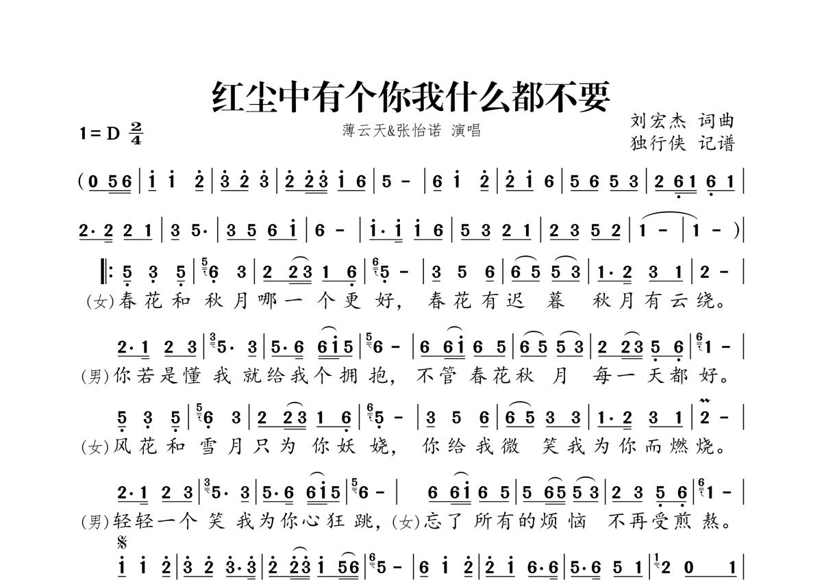 薄云天&张怡诺《红尘中有个你我什么都不要》简谱