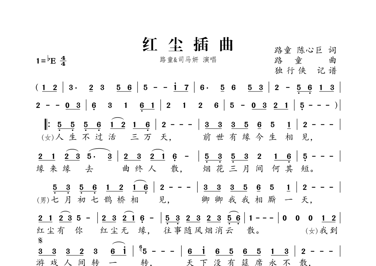 《红尘插曲》是路童&司马妍演唱的一首歌曲,拍号为4/4拍,这份简谱共有一张高清图谱,图谱由 @独行侠 编配上传。