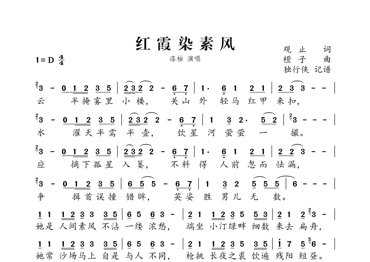 《红霞染素风》是漆柚演唱的一首歌曲,拍号为4/4拍,这份简谱共有一张高清图谱,图谱由 @独行侠 编配上传。