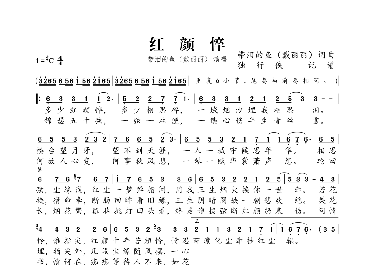《红颜悴》是带泪的鱼(戴丽丽))演唱的一首歌曲,拍号为4/4拍,这份简谱共有一张高清图谱,图谱由 @独行侠 编配上传。