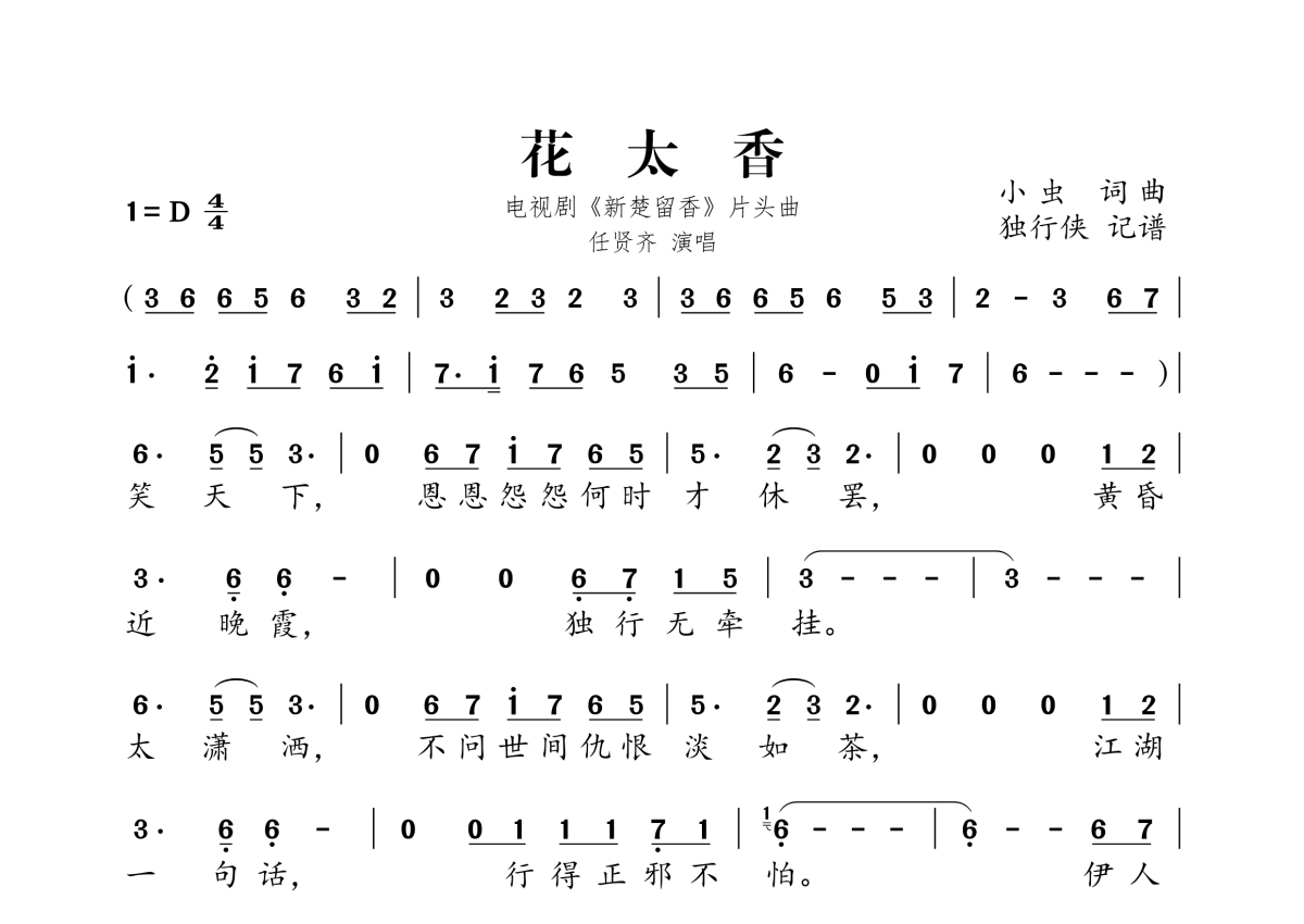 《花太香》是任贤齐演唱的一首歌曲,拍号为4/4拍,这份简谱共有两张高清图谱,图谱由 @独行侠 编配上传。