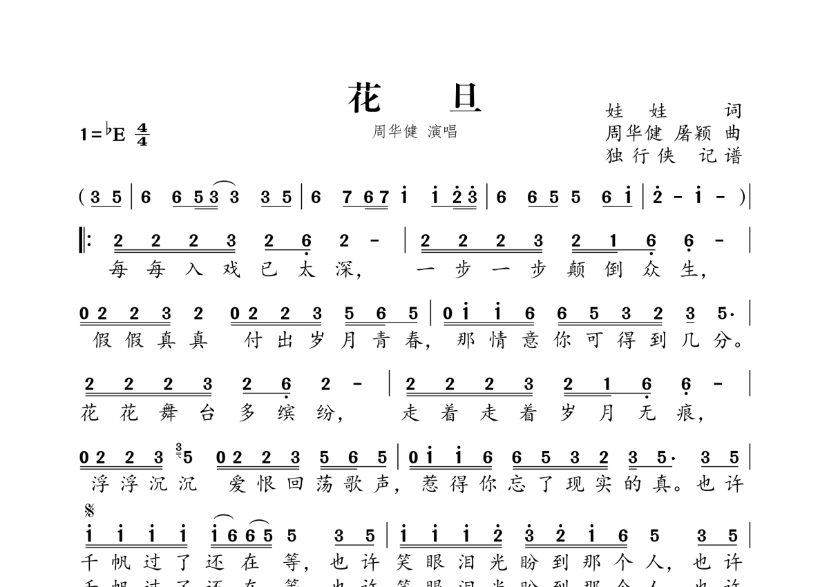 《花旦》是周华健演唱的一首歌曲,拍号为4/4拍,这份简谱共有一张高清图谱,图谱由 @独行侠 编配上传。