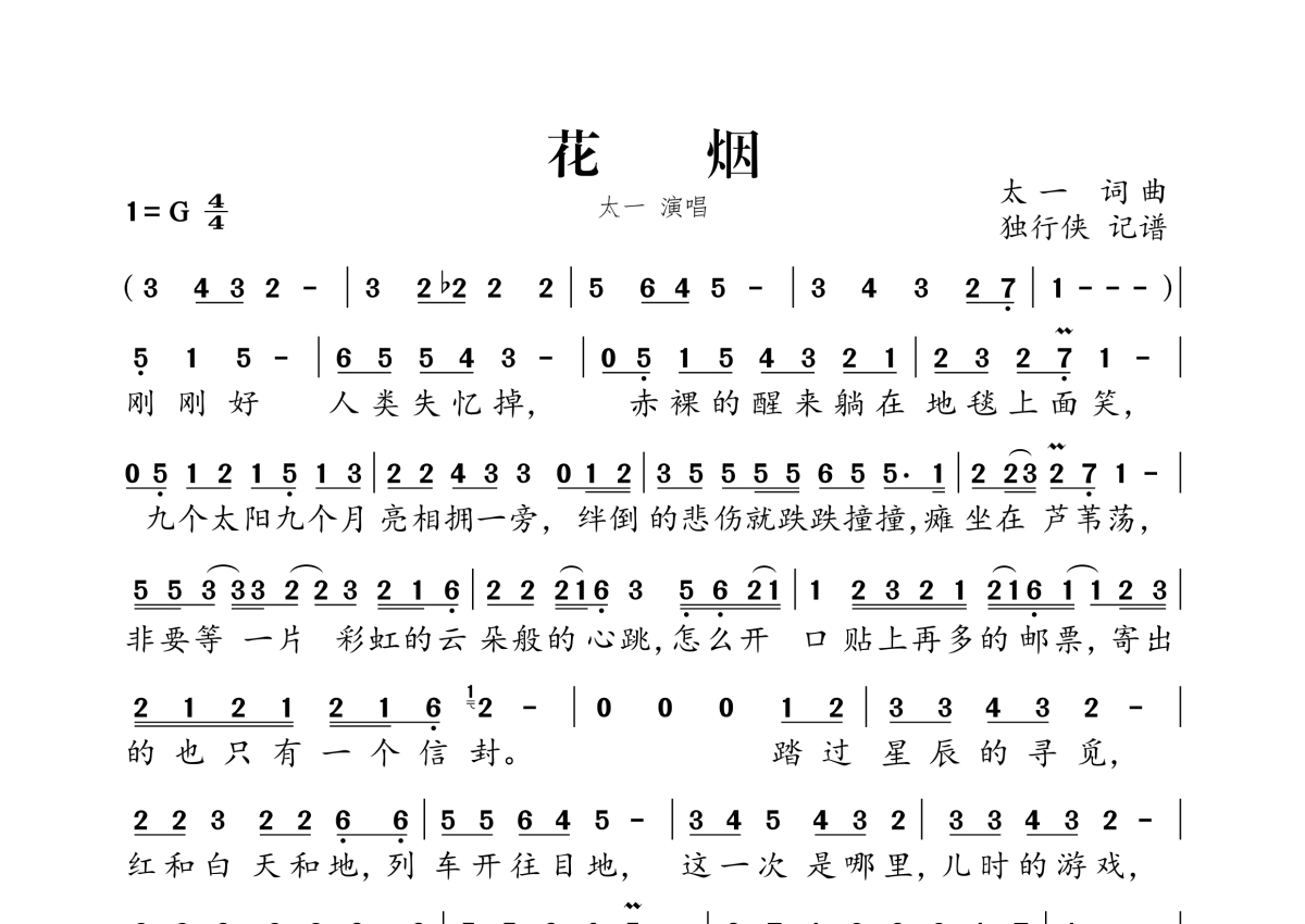 《花烟》是太一演唱的一首歌曲,拍号为4/4拍,这份简谱共有一张高清图谱,图谱由 @独行侠 编配上传。