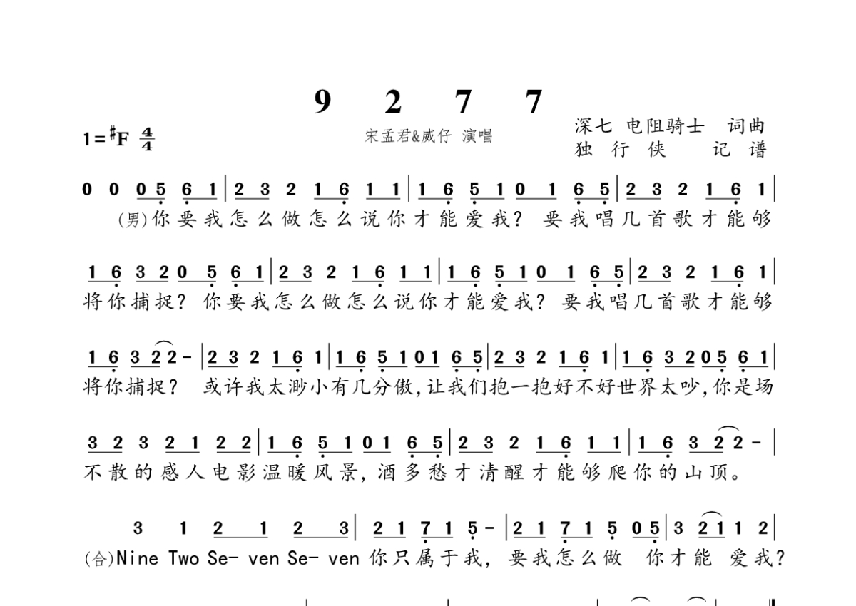 《9277》是宋孟君&威仔演唱的一首歌曲,拍号为4/4拍,这份简谱共有一张高清图谱,图谱由 @独行侠 编配上传。