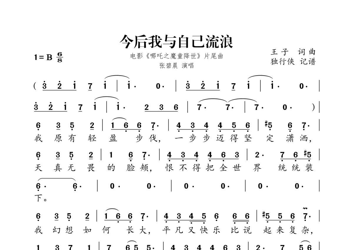《今后我与自己流浪》是张碧晨演唱的一首歌曲,拍号为6/8拍,这份简谱共有两张高清图谱,图谱由 @独行侠 编配上传。