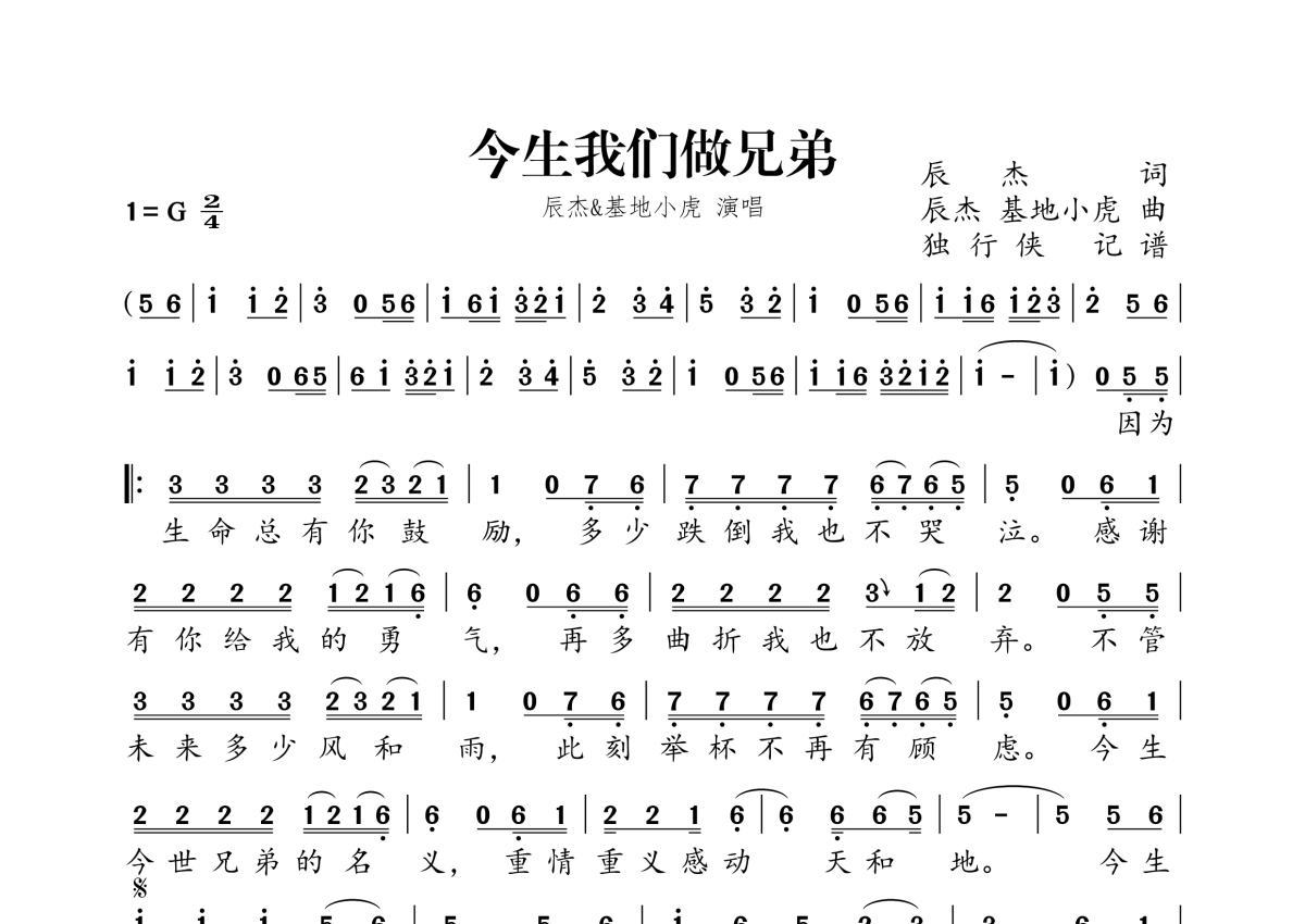 《今生我们做兄弟》是辰杰&基地小虎演唱的一首歌曲,拍号为2/4拍,这份简谱共有一张高清图谱,图谱由 @独行侠 编配上传。