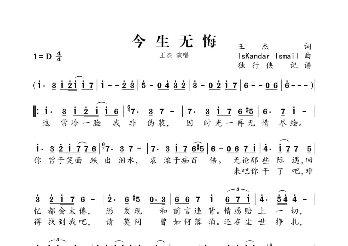 《今生无悔》是王杰演唱的一首歌曲,拍号为4/4拍,这份简谱共有一张高清图谱,图谱由 @独行侠 编配上传。