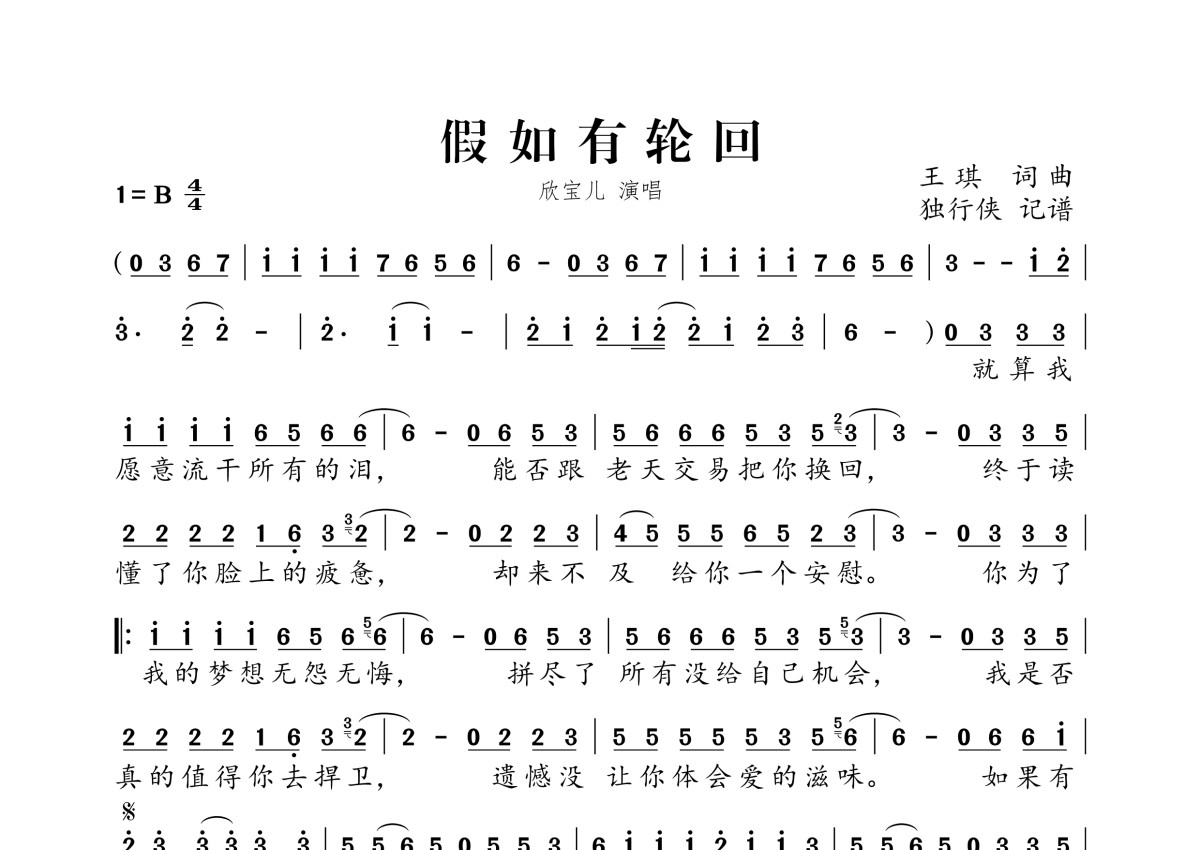 《假如有轮回》是欣宝儿演唱的一首歌曲,拍号为4/4拍,这份简谱共有一张高清图谱,图谱由 @独行侠 编配上传。