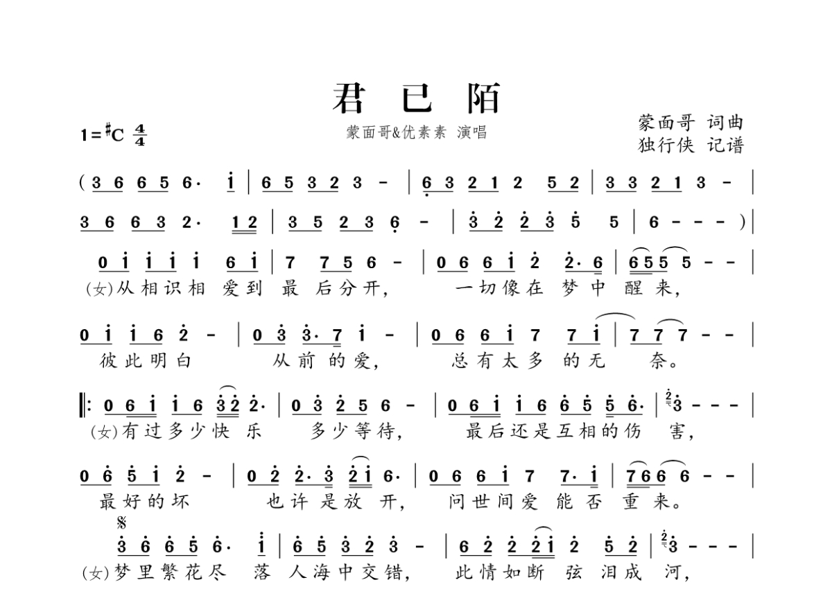 蒙面哥&优素素《君已陌》简谱