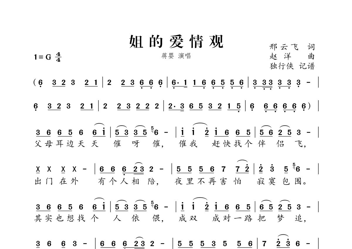《姐的爱情观》是蒋婴演唱的一首歌曲,拍号为4/4拍,这份简谱共有一张高清图谱,图谱由 @独行侠 编配上传。