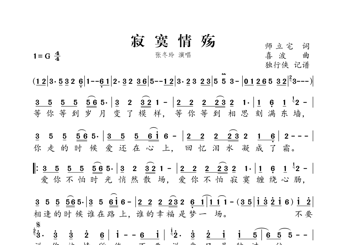 《寂寞情殇》是张冬玲演唱的一首歌曲,拍号为4/4拍,这份简谱共有一张高清图谱,图谱由 @独行侠 编配上传。