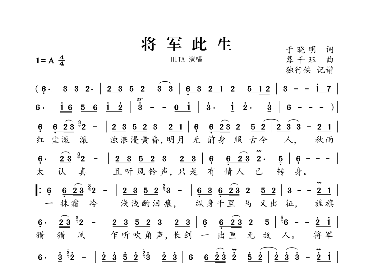 《将军此生》是HITA演唱的一首歌曲,拍号为4/4拍,这份简谱共有一张高清图谱,图谱由 @独行侠 编配上传。