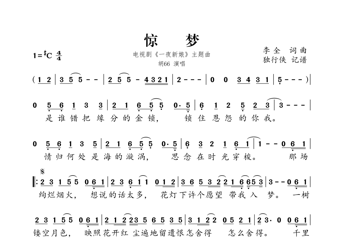 《惊梦》是胡66演唱的一首歌曲,拍号为4/4拍,这份简谱共有一张高清图谱,图谱由 @独行侠 编配上传。