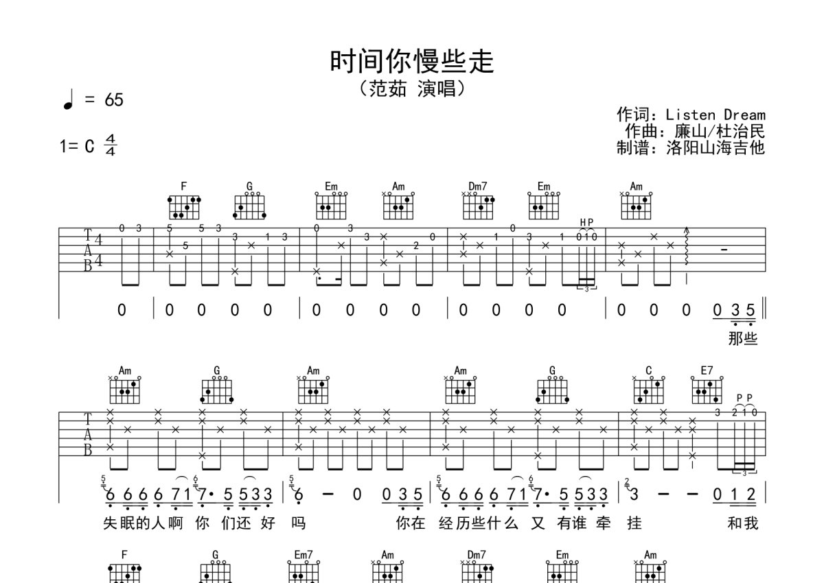 《时间你慢些走》是范茹演唱的一首歌曲,本吉他谱采用的是C调指法编配,这份吉他谱共有两张高清图谱,图谱由 @何奔洋 编配上传,图谱使用六线谱编配,包含吉他和弦指法、简谱以及歌词部分,曲谱配备了相关的音频提供试听,使用这份时间你慢些走吉他谱,可以让你更加方便地掌握这首歌曲的弹唱技巧,快来尝试吧。范茹《时间你慢些走》吉他谱_C调吉他弹唱谱。