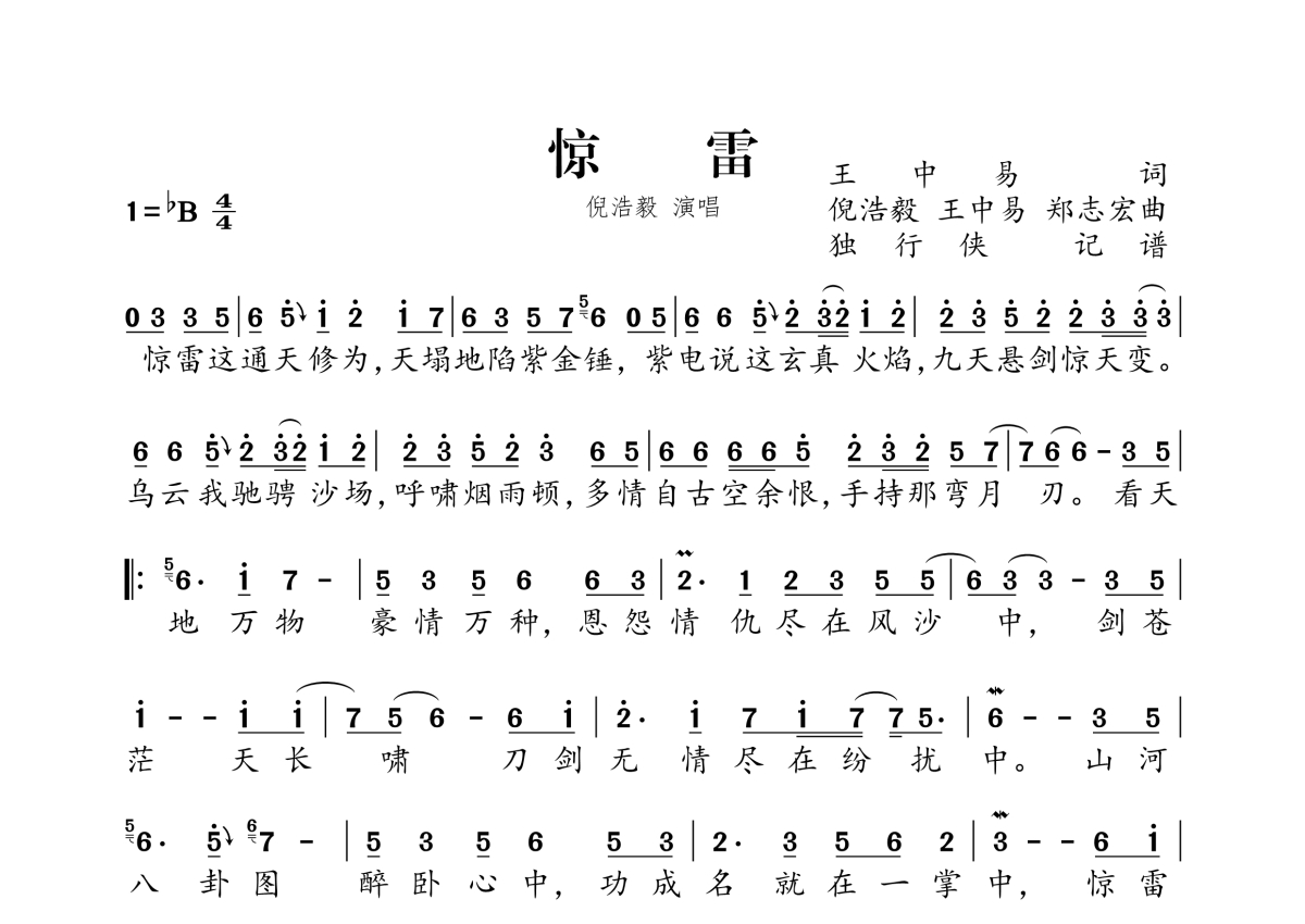《惊雷》是倪浩毅演唱的一首歌曲,拍号为4/4拍,这份简谱共有一张高清图谱,图谱由 @独行侠 编配上传。