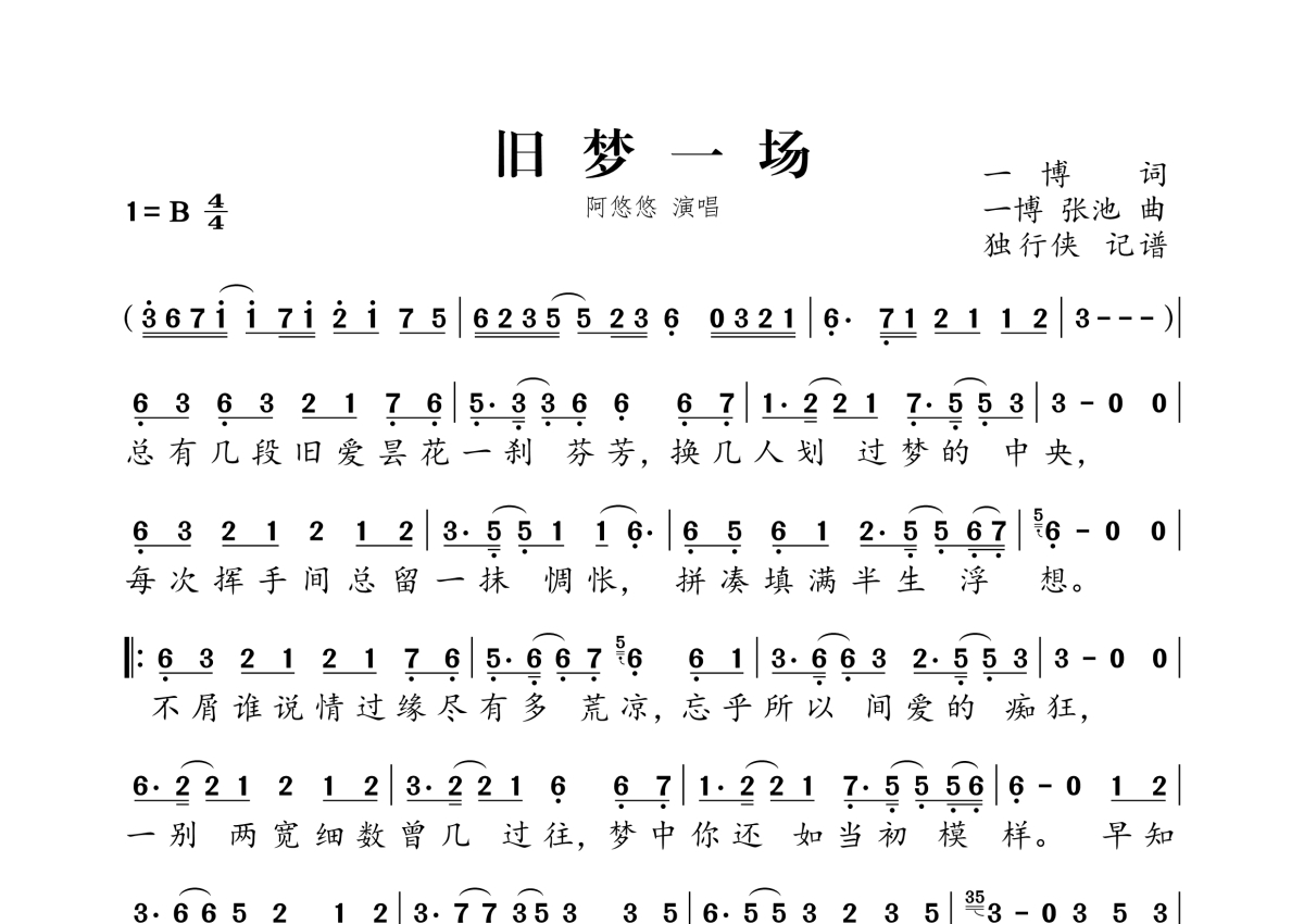 《旧梦一场》是阿悠悠演唱的一首歌曲,拍号为4/4拍,这份简谱共有一张高清图谱,图谱由 @独行侠 编配上传。