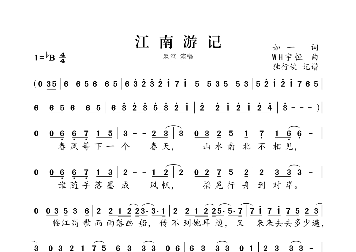 《江南游记》是双笙 (陈元汐)演唱的一首歌曲,拍号为4/4拍,这份简谱共有两张高清图谱,图谱由 @独行侠 编配上传。