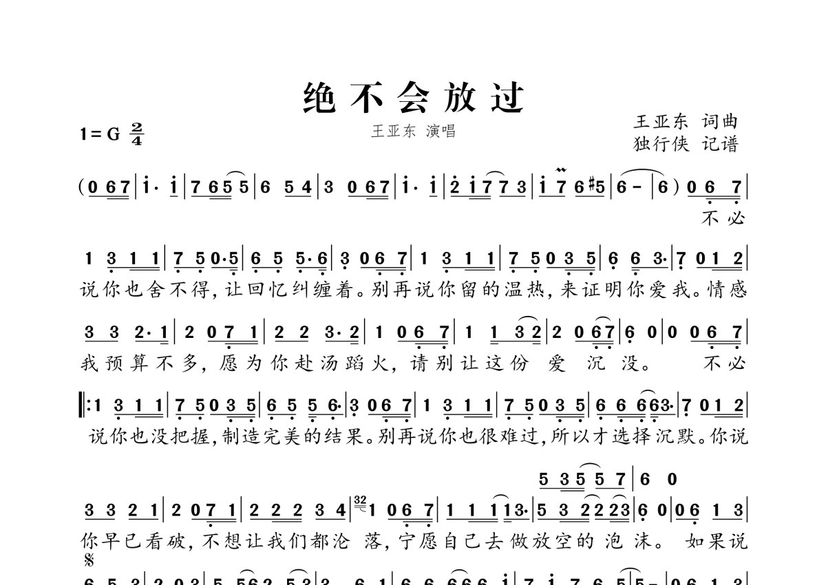 王亚东《绝不会放过》简谱 - 王亚东版