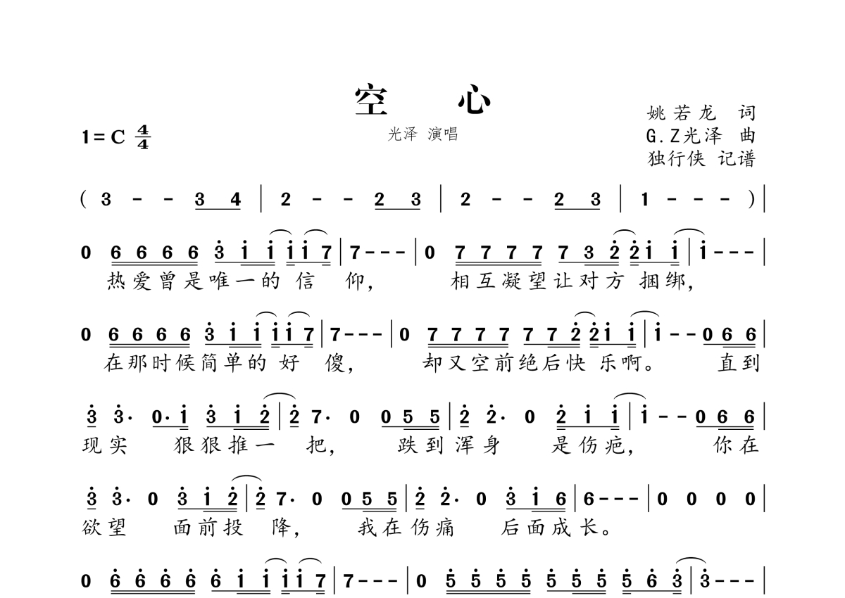 《空心》是光泽演唱的一首歌曲,拍号为4/4拍,这份简谱共有两张高清图谱,图谱由 @独行侠 编配上传。