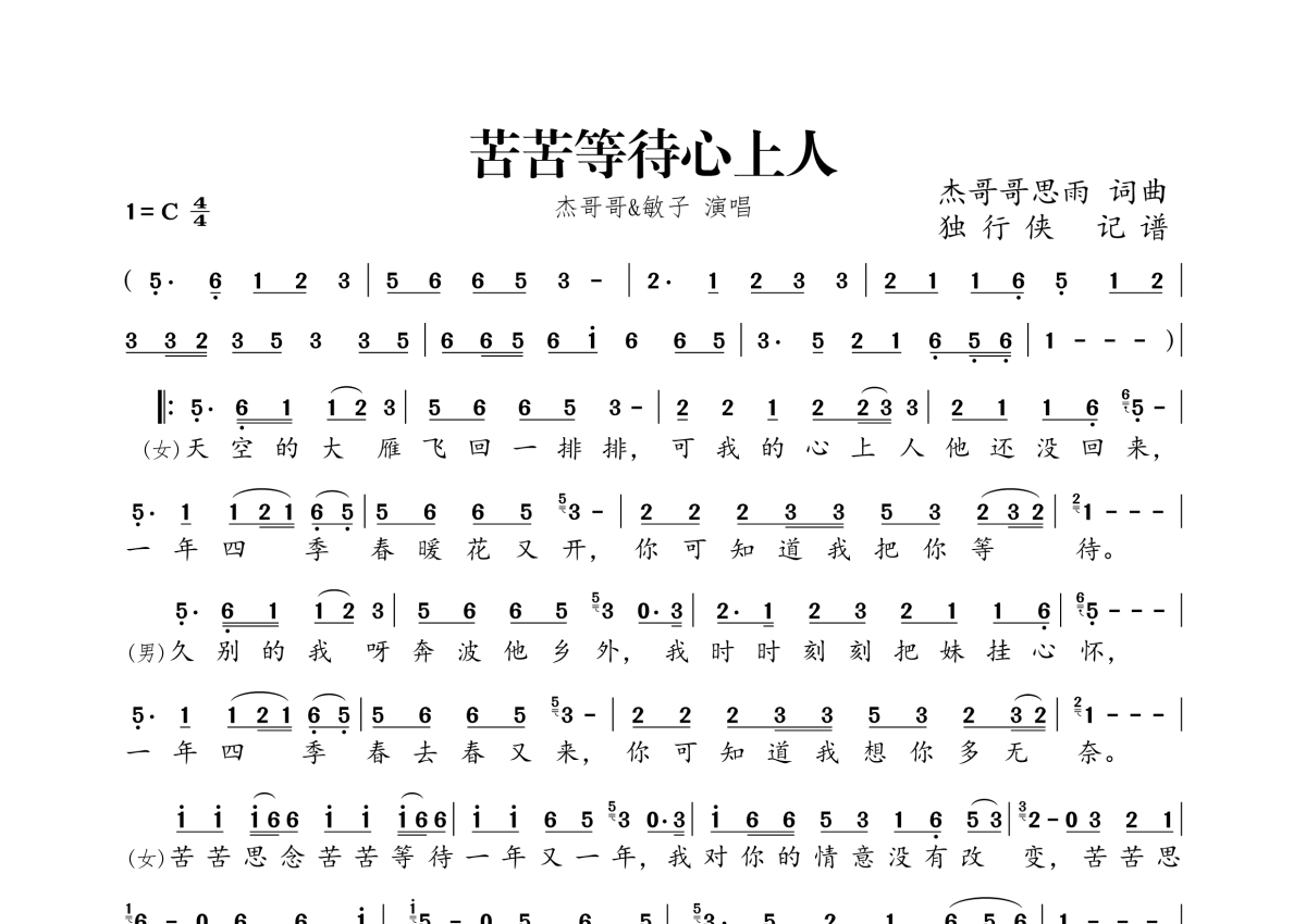 《苦苦等待心上人》是杰哥哥&敏子演唱的一首歌曲,拍号为4/4拍,这份简谱共有一张高清图谱,图谱由 @独行侠 编配上传。