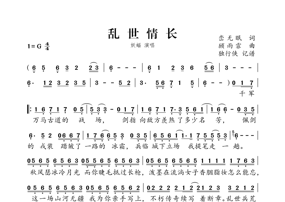 《乱世情长》是妖蝠演唱的一首歌曲,拍号为4/4拍,这份简谱共有一张高清图谱,图谱由 @独行侠 编配上传。
