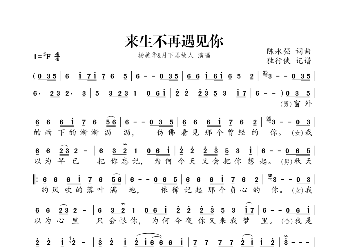 《来生不再遇见你》是杨美华&月下思故人演唱的一首歌曲,拍号为4/4拍,这份简谱共有一张高清图谱,图谱由 @独行侠 编配上传。