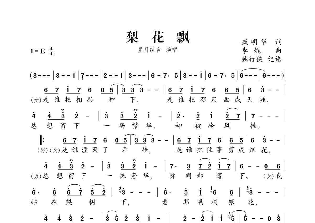 《梨花飘》是星月组合演唱的一首歌曲,拍号为4/4拍,这份简谱共有一张高清图谱,图谱由 @独行侠 编配上传。