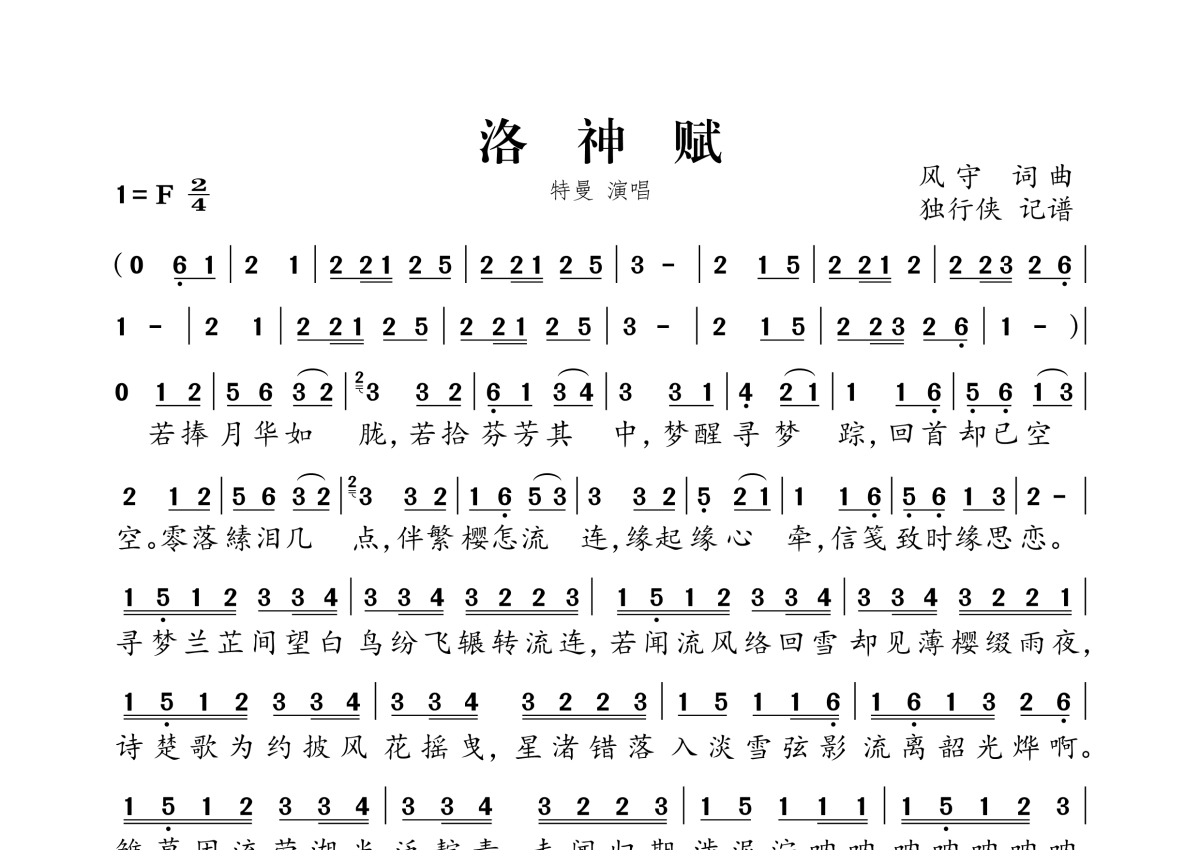 《洛神赋》是特曼演唱的一首歌曲,拍号为2/4拍,这份简谱共有两张高清图谱,图谱由 @独行侠 编配上传。