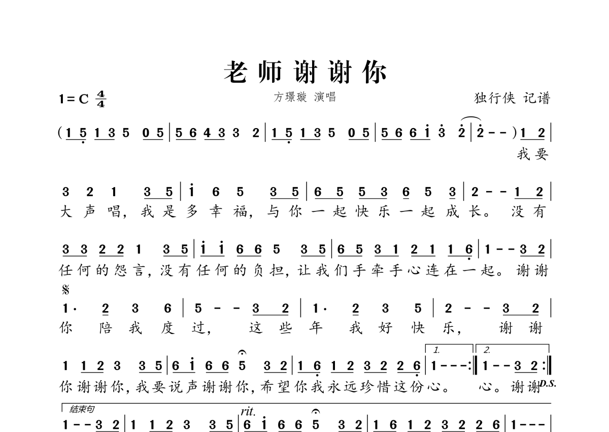 《老师谢谢你》是方璟璇演唱的一首歌曲,拍号为4/4拍,这份简谱共有一张高清图谱,图谱由 @独行侠 编配上传。