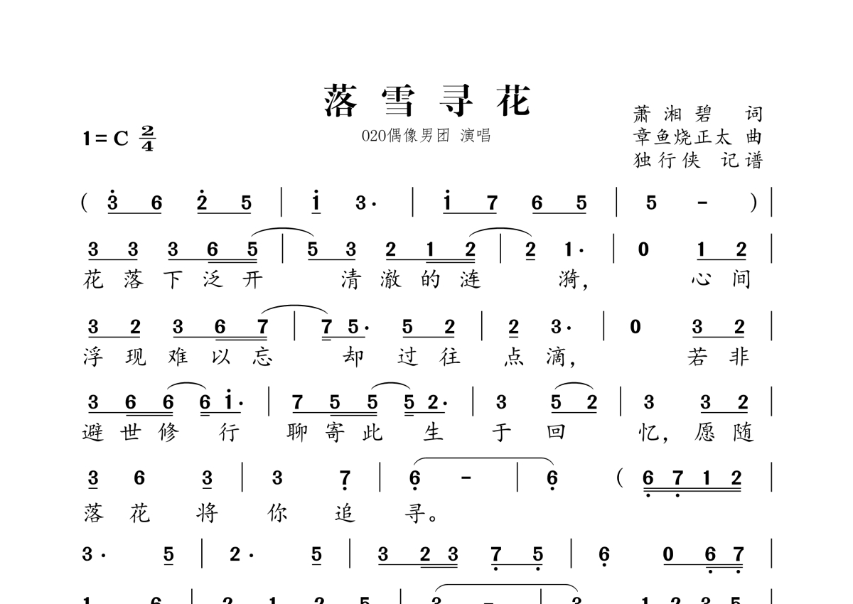 《落雪寻花》是O2O偶像男团演唱的一首歌曲,拍号为2/4拍,这份简谱共有三张高清图谱,图谱由 @独行侠 编配上传。