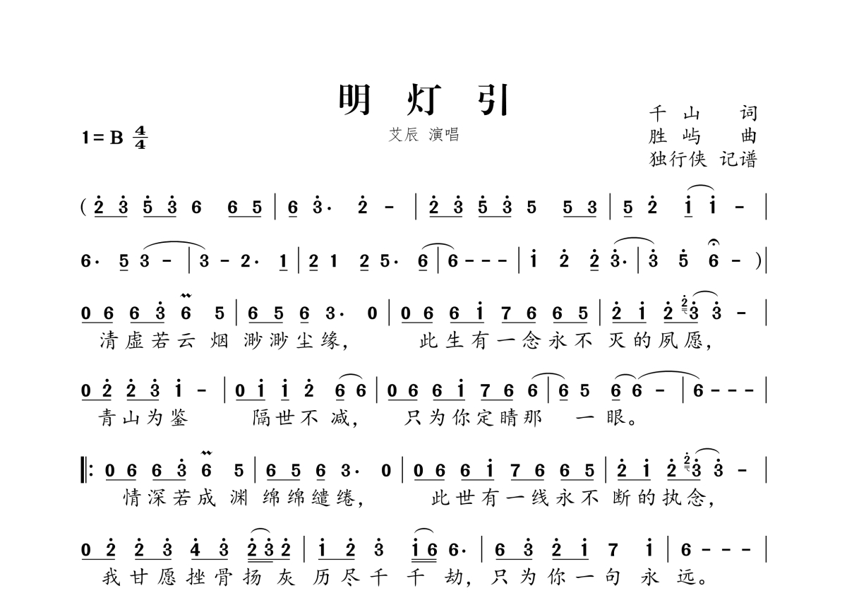 《明灯引》是艾辰演唱的一首歌曲,拍号为4/4拍,这份简谱共有一张高清图谱,图谱由 @独行侠 编配上传。