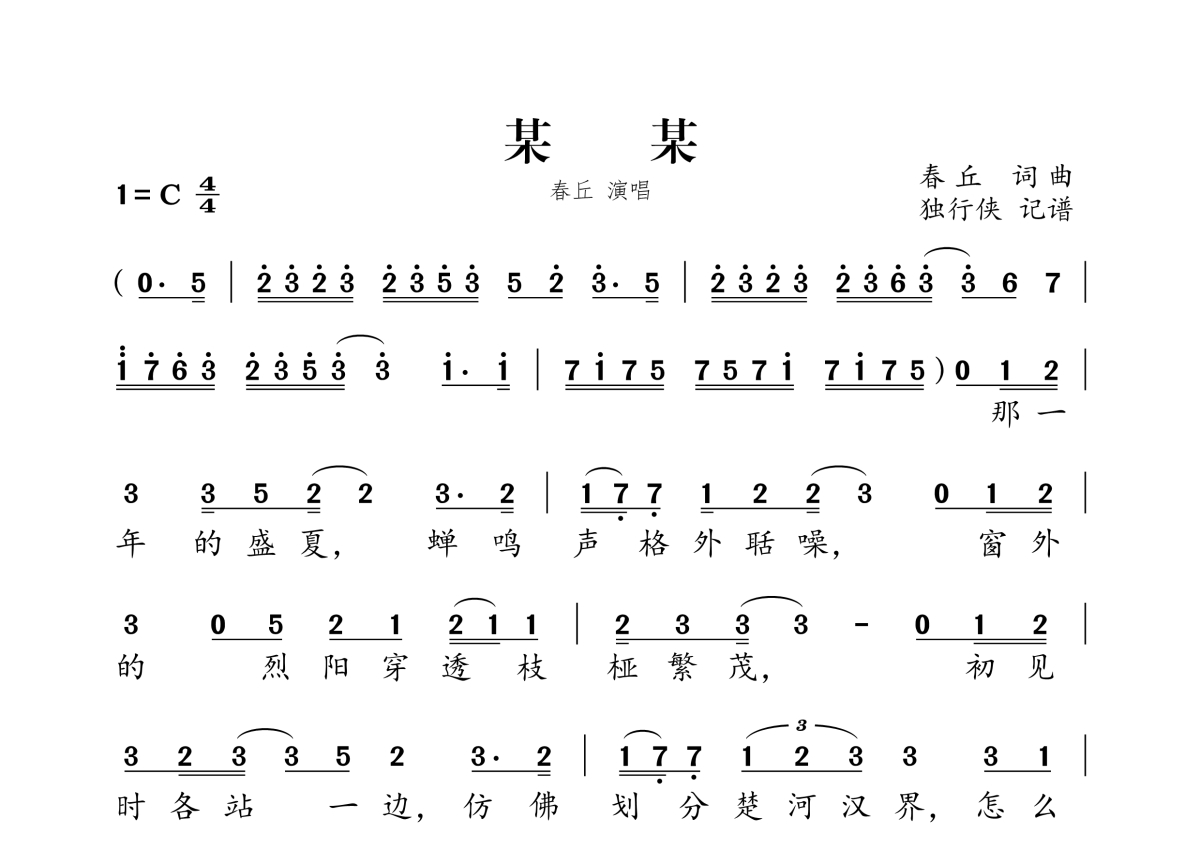 《某某》是春丘演唱的一首歌曲,拍号为4/4拍,这份简谱共有三张高清图谱,图谱由 @独行侠 编配上传。