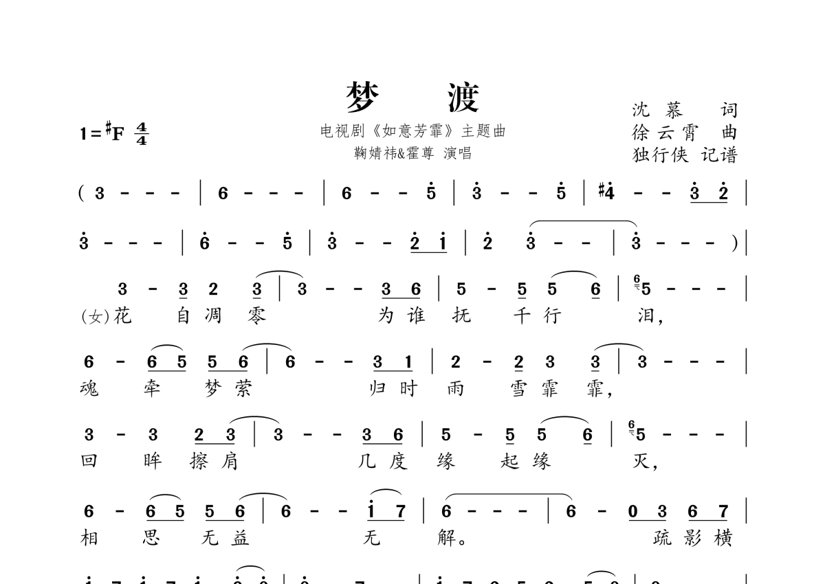 《梦渡》是鞠婧祎、霍尊演唱的一首歌曲,拍号为4/4拍,这份简谱共有两张高清图谱,图谱由 @独行侠 编配上传。