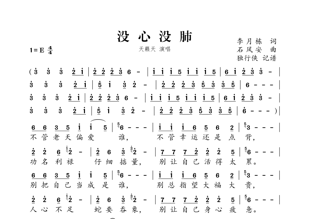 《没心没肺》是天籁天演唱的一首歌曲,拍号为4/4拍,这份简谱共有一张高清图谱,图谱由 @独行侠 编配上传。